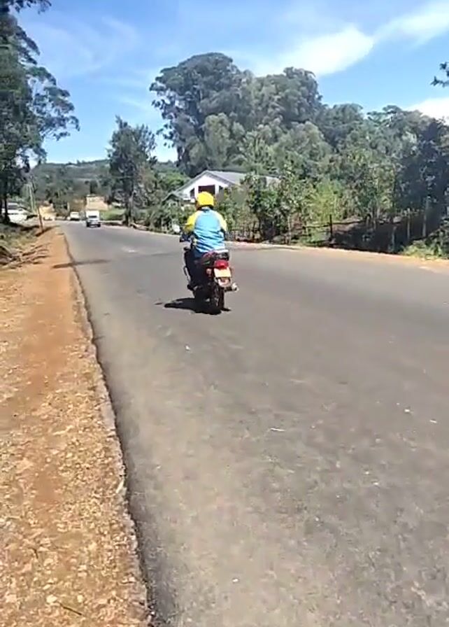 person riding a black motorcycle on a paved road. The rider is wearing a yellow helmet and a blue and light blue jacket. The road is bordered by trees and houses. The sky is blue with some clouds. Other vehicles can be seen further down the road. The video is taken from a stationary position on the side of the road.