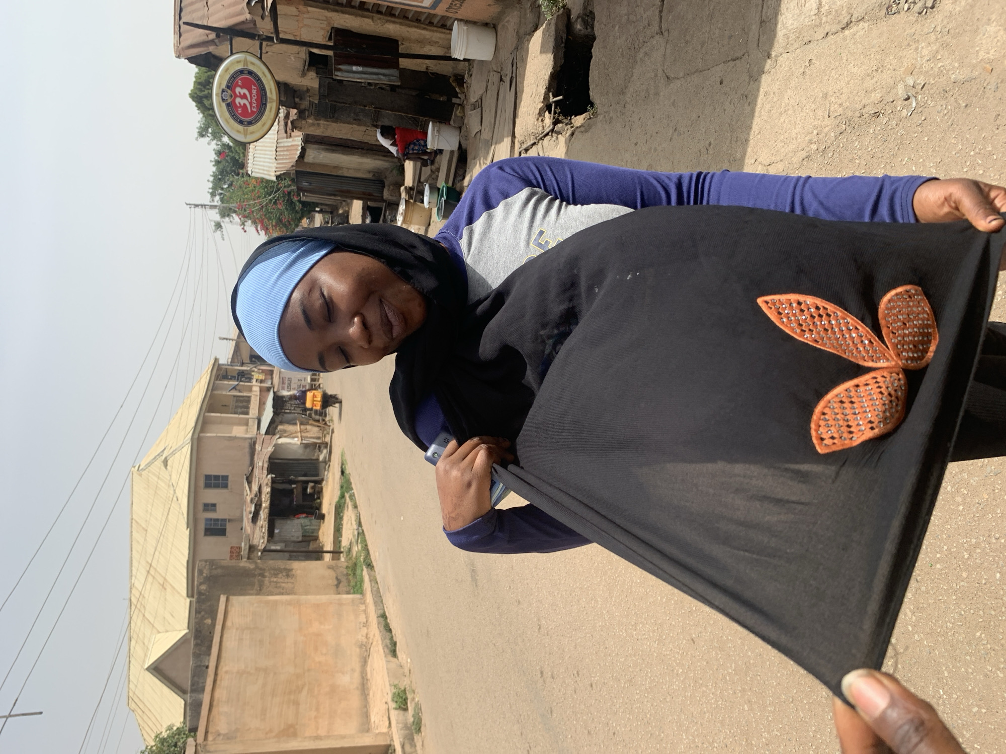 An image captured in Jos, Nigeria, depicts a woman on a street, presenting a black fabric garment. The woman, of apparent African descent, is centrally positioned, wearing a light blue ribbed headscarf beneath a black hijab and a long-sleeved shirt with a grey torso and blue sleeves. Her eyes are closed, and she displays a slight smile. She holds a dark-colored feature phone in her right hand, partially obscured against her chest. With both hands, she stretches a large piece of black fabric, which features an orange, leaf-like, sequined appliqué design. A second, dark-skinned hand is visible in the lower-left foreground, also holding the black fabric, suggesting an interaction or collaborative display. The setting is an urban street under a bright, possibly hazy sky. Overhead utility lines are visible. In the left background, a multi-story building with a light-colored, gabled roof and walls stands behind a low concrete wall. Adjacent to it are smaller, informal structures with corrugated metal roofs, indicative of commercial stalls. On the right side of the image, an oval-shaped "33 Export" beer sign is mounted on a pole above more informal stalls. The street surface is paved but appears dusty, with an open drainage ditch partially covered by a wooden plank near the right sidewalk. Various buckets (white, green) and debris are present along the roadside. A person on a yellow motorcycle is visible in the distance on the street, and another individual in a red shirt is seated near a stall in the far background.