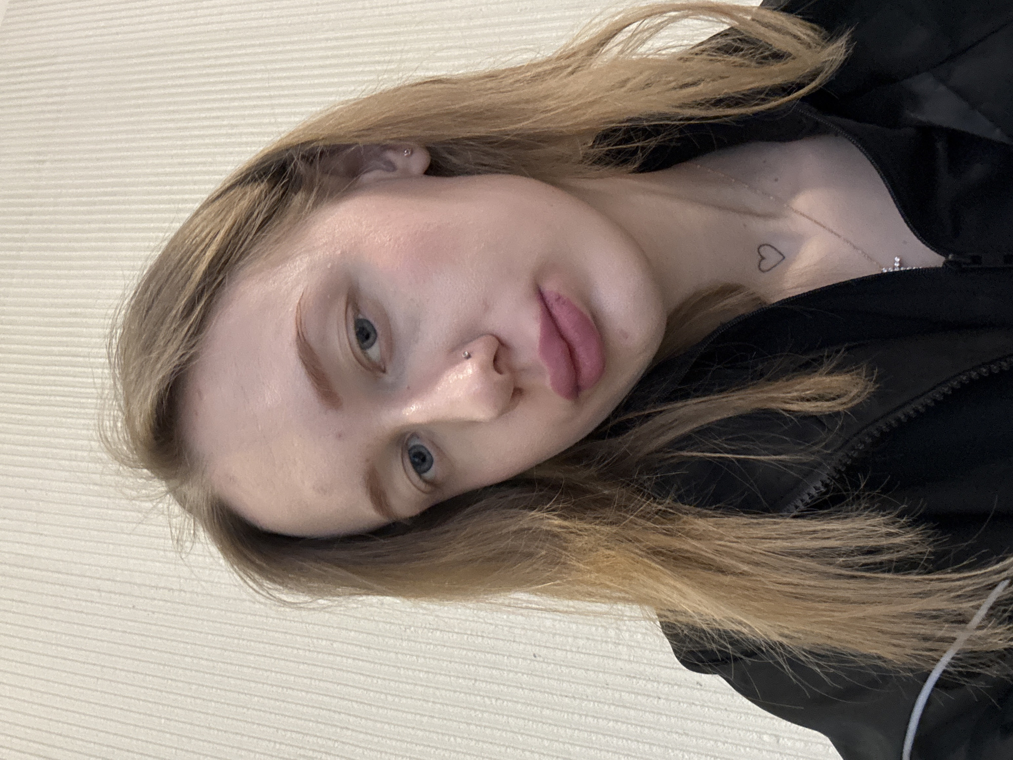 A close-up, slightly rotated, selfie-style photograph shows a young woman with fair skin and blonde hair