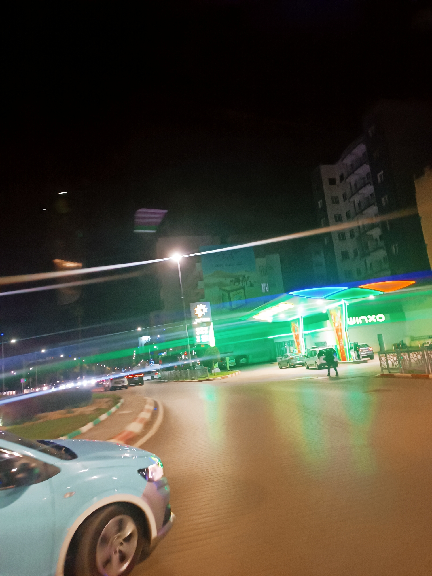 At night in Meknes, Morocco, a light blue car is captured in motion, curving along a well-lit street. The scene is defined by the bright lights of a WINXO gas station on the right, where at least one pedestrian is visible. Other vehicles are present at the gas station and on the road, indicating vehicular traffic. In the background, a multi-story building rises above the gas station. Streetlights line the road, casting a bright glow across the scene. The road is marked with green and red and white painted curbs on the shoulder. There is also a large billboard adjacent to the station.