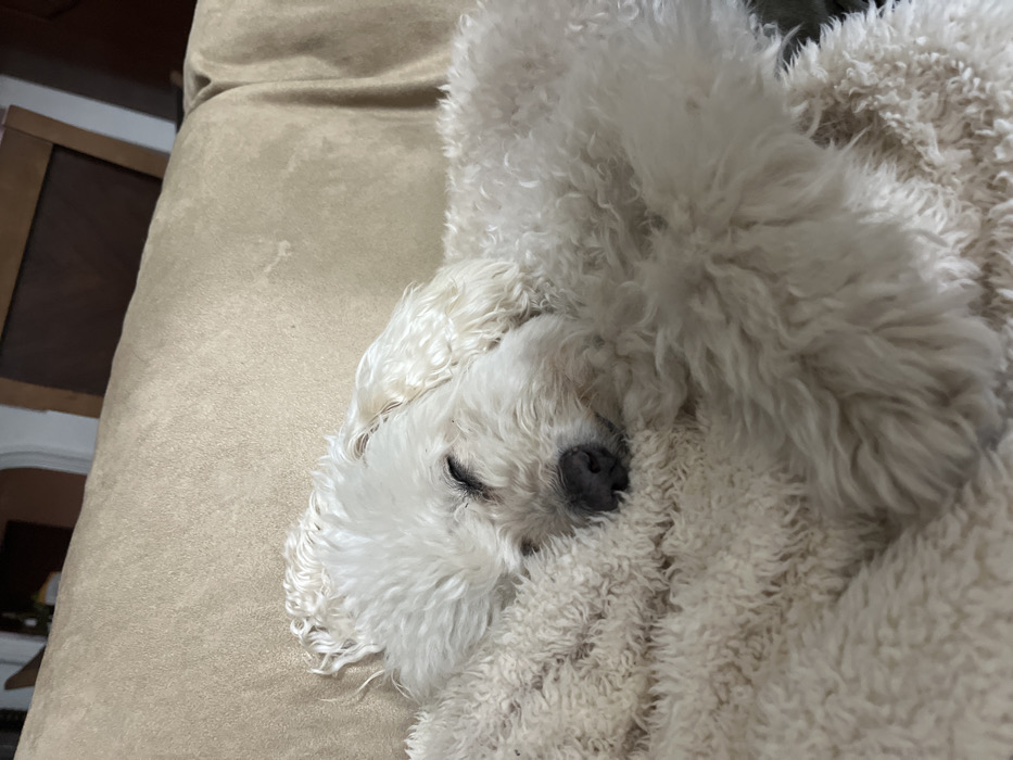 A white, curly-haired canine subject is depicted in a state of repose