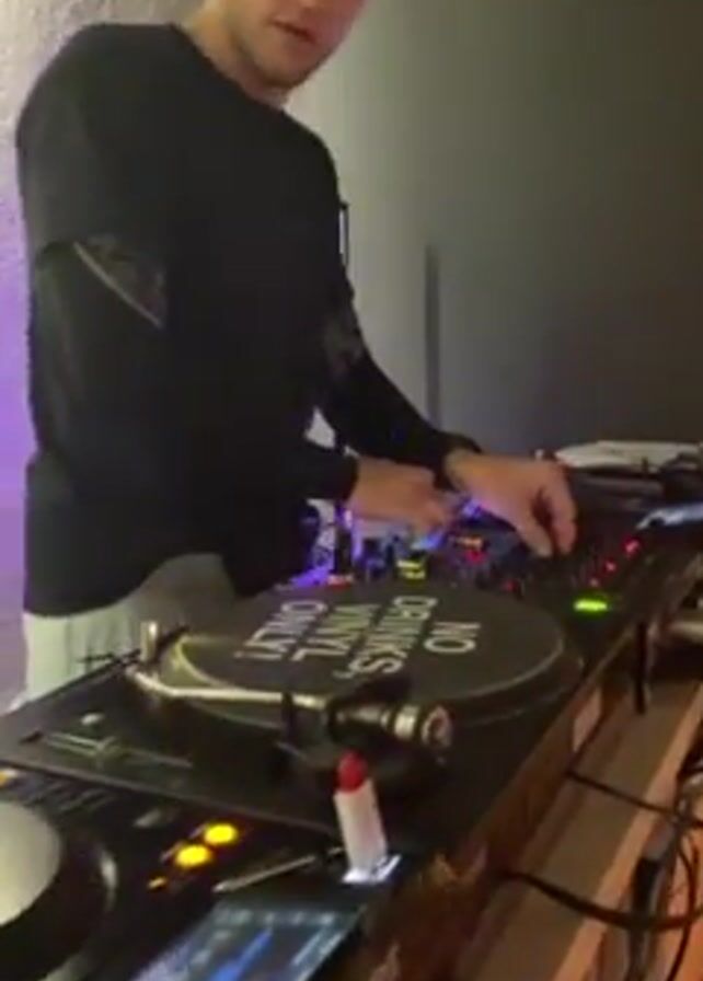 A man wearing a black long-sleeve shirt, headphones, and light-colored pants is DJing