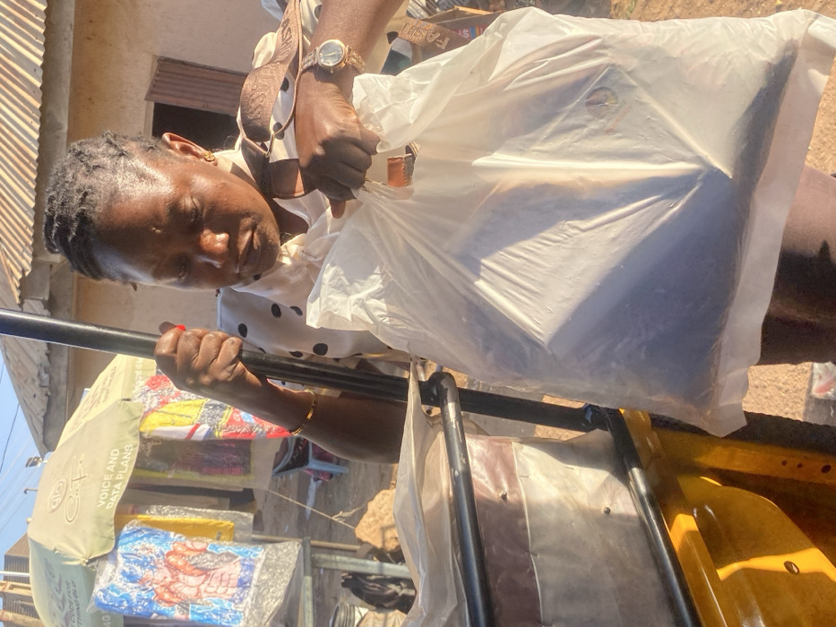 The image captures an outdoor scene in Sabon Tasha, Nigeria. A dark-skinned adult female, with braided hair, is centrally positioned, looking downwards. She wears a light-colored, polka-dotted blouse, a patterned scarf or strap over her right shoulder, a gold-colored watch on her left wrist, and a gold-colored bracelet on her right wrist; red nail polish is visible on her right hand. She holds a translucent white plastic bag, containing a prominent white rectangular object and other darker items, with both hands. Her right hand also grips a black metal bar, which appears to be part of a yellow vehicle or a street vendor's stall structure. In the background, under bright natural sunlight, a light-colored umbrella displaying "VOICE AND DATA PLANS" and "CAPA" text shades various hanging garments, including a blue shirt with a stylized figure. A blue plastic chair is partially visible beneath the umbrella. The ground is uneven and dusty, and a building with a corrugated metal roof is present in the far background.