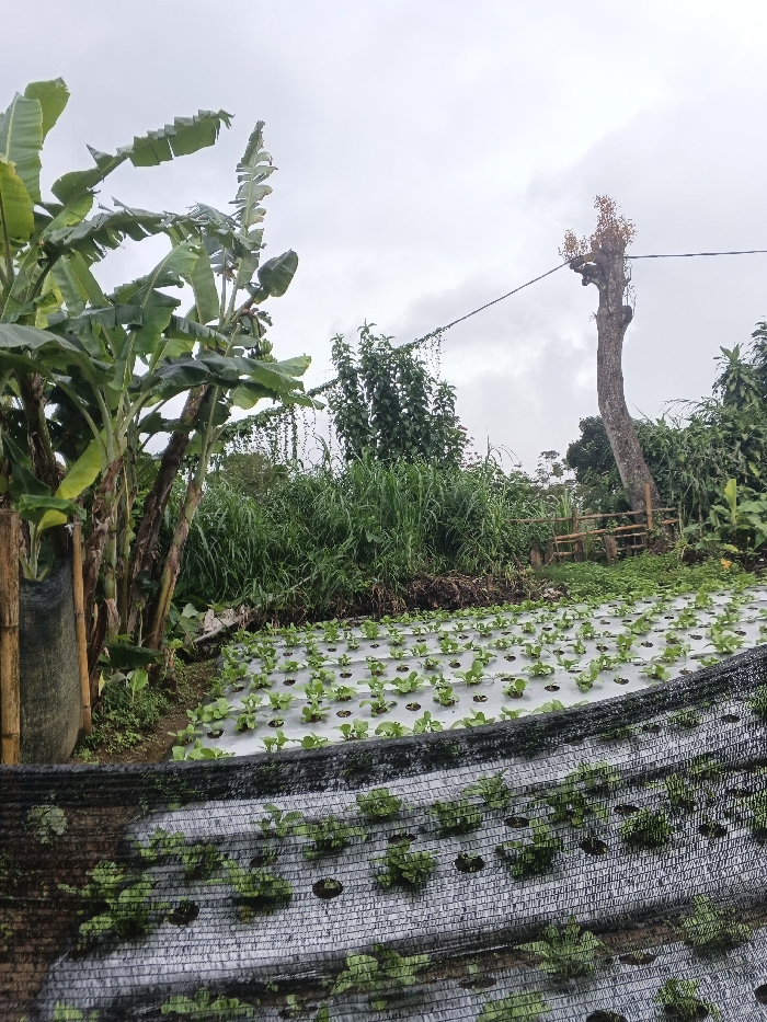 This image depicts an agricultural plot in Unknown, Nepal, under an overcast sky. In the immediate foreground, a black mesh netting stretches across the bottom of the frame, partially obscuring rows of young green plants growing through perforated white plastic mulch. Behind this netting, the main agricultural field displays numerous small, leafy green plants, possibly vegetables, uniformly planted in parallel rows through sheets of white plastic mulch that cover the soil. To the far left, a cluster of banana trees stands prominently, displaying large green leaves and a visible bunch of green bananas. Further into the midground and background, dense green vegetation, including tall grasses and various trees and bushes, forms a natural barrier. On the right side of the frame, a tall, bare tree trunk, possibly dead or severely pruned, serves as a utility pole, supporting a single dark wire that extends across the upper midground. A rudimentary wooden fence or barrier is visible behind the planted field on the right. No people or animals are present.