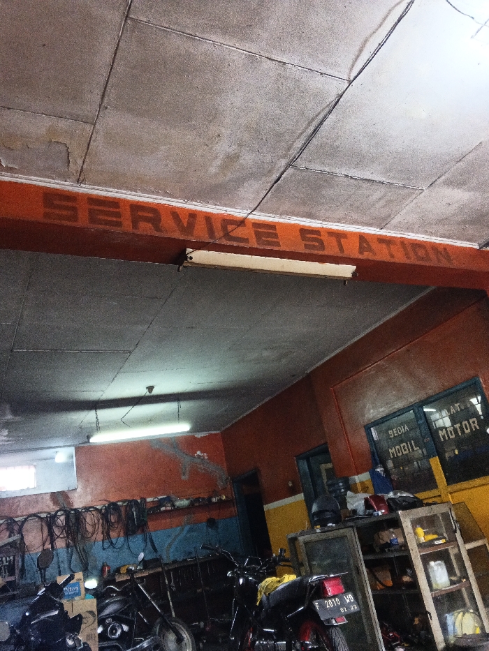 This image captures the interior of a service station located in an unknown city. The scene is static, devoid of people, active actions, or interactions. The environment is a cluttered garage space, illuminated by multiple fluorescent light fixtures, including one mounted on a prominent orange beam across the upper frame. This beam bears the stenciled text "SERVICE STATION" in dark red letters. The ceiling consists of grey, tiled panels, exhibiting stains and minor damage. The walls are painted with a two-tone scheme: the upper section is a faded reddish-orange, while the lower section transitions to blue and yellow. Paint appears worn or peeling in several areas. On the left wall, a small, high-set rectangular window is visible, along with a shelf holding various hanging cables or hoses. On the right side of the image, a large window or glass panel is visible, with white painted text including "SEDIA MOBIL MOTOR" (Available Car Motor), confirming the establishment's function. Below this window, a metal or wooden display cabinet with glass panels holds assorted items such as bottles, containers, and tools. A black motorcycle helmet rests on top of this cabinet. The lower portion of the garage floor is occupied by multiple motorcycles in various states of assembly. A black motorcycle with a red rear fender and taillight is prominent in the center-right, displaying a partially visible license plate "F 2010 WB". Another partially visible motorcycle is on the far left, and additional motorcycle frames or parts are scattered throughout the workshop area. Shelves containing tools and parts line the walls.