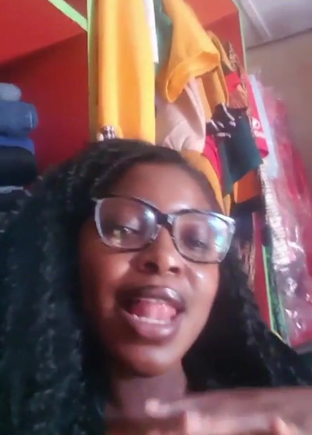 A woman with dark skin, long dark hair styled with braids, and glasses, is speaking to the camera. She is indoors, in front of a closet. The closet has red sides and green shelves, and is filled with folded clothes, and hanging garments in yellow, black and white prints, and other colors. The woman is wearing a dark-colored top. Her expression is animated, and she is smiling with her mouth open as she talks.