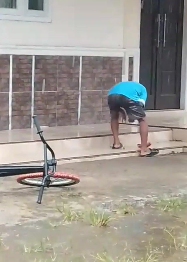 The video depicts two young people interacting in front of a house during heavy rain. One of the children, dressed in a blue shirt and shorts, is bending down and appears to be examining something on the steps of the house's porch. The second child, wearing a white shirt and shorts, stands beside him, also looking down. The ground is waterlogged, and grass is visible emerging from the water. In the foreground, a bicycle with its wheel turned upwards is lying on the wet surface. The house behind them has a tiled porch wall and a dark double door.