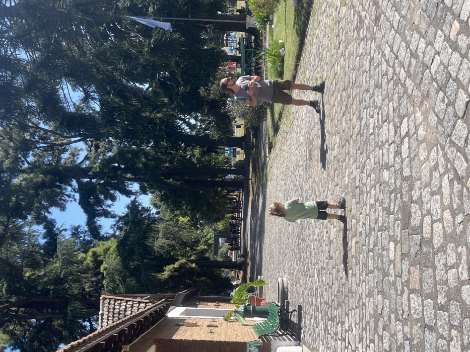 The image displays an outdoor scene within a park in Quilmes Oeste, Argentina, under a clear, bright sky. A cobblestone path covers the foreground and extends into the midground. Standing on this path, a young child with light brown hair, dressed in a light green t-shirt, dark shorts, and dark shoes, faces away from the camera. To the child's right, an adult male with long dark hair, a beard, and sunglasses stands, looking towards the right of the frame while holding a smartphone. He is attired in a light gray t-shirt, dark khaki shorts, and dark shoes. On the left side of the scene, a brick building with a brown tiled roof is partially visible, featuring a green metal bench attached to its exterior. Adjacent to the bench is a dark green decorative metal object topped with a potted plant. The background is densely populated with tall evergreen trees. Through these trees, a light blue and white flag is discernible on a flagpole in the far right. Multiple blurred figures are visible further down the path and within grassy areas in the distance, alongside faint indications of playground equipment. Distinct shadows are cast across the cobblestone path, indicating strong sunlight.
