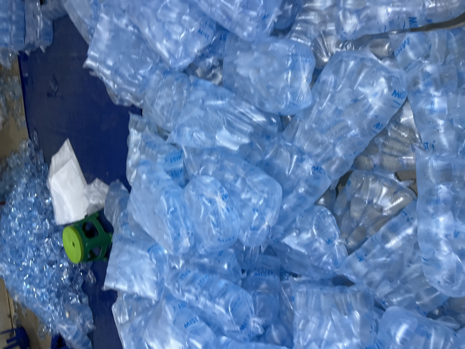 The image displays a large pile of preform PET water bottles packed in clear bags. There's also loose bottles. A blue surface is visible in the background, along with a green and yellow toy. The bottles appear to be awaiting further processing in a manufacturing setting.