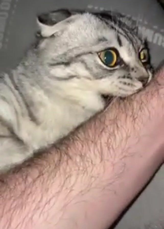 A person is holding up their left arm, and a gray and white tabby cat is biting down on it with its teeth. The cat is facing to the left, and has its eyes wide open. The person's arm is hairy. The background is a gray blanket or pillow with some writing. The cat is a Scottish Fold.