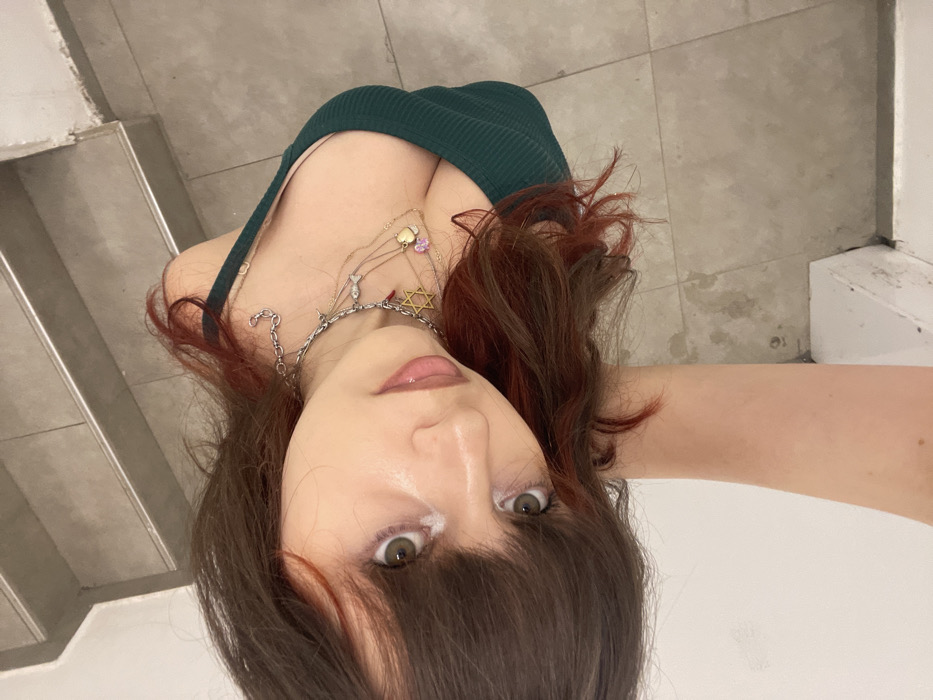 A woman takes a selfie from a low angle, tilting her head. She has brown hair with red highlights, bangs, and light skin. She wears a green ribbed top and multiple necklaces, including one with a Star of David. A staircase is visible to the left, and tiled flooring to the right. Her lips are glossy, and her eyes are wide.