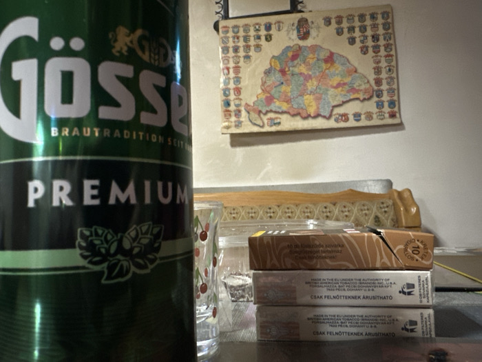 The image captures an indoor still life scene in Páty, Hungary, focused on a collection of items on a reflective dark surface against a light-colored wall. A large, metallic green can, labeled "Gösser PREMIUM" in white text with a hop-leaf emblem, occupies the foreground on the left. To its right, a clear glass with a repeating red cherry pattern is visible. Further right, a stack of three cigarette packs is present, with the topmost pack partially open. The side of these packs displays text in Hungarian, "CSAK FELNŐTTEKNEK ÁRUSÍTHATÓ" (FOR ADULTS ONLY), and English, "MADE IN THE EU UNDER THE AUTHORITY OF BRITISH AMERICAN TOBACCO (BRAND) INC. U.S.A." Behind the glass and cigarette packs, a light-colored wooden decorative item with a repeating geometric pattern rests on the surface. On the wall in the background, a hanging map of Hungary, segmented into various colors representing regions, is visible, framed by numerous small heraldic crests. A thin yellow cable is also present on the dark surface, extending from the right side. No individuals or active interactions are depicted.
