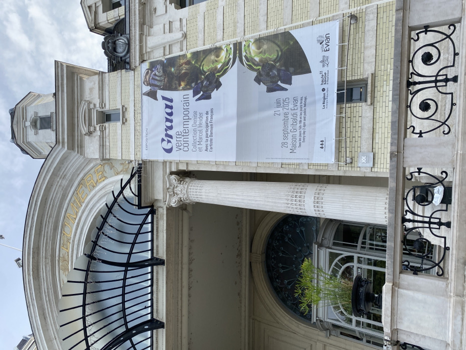 The image displays a low-angle exterior view of the Maison Gribaldi, also known as the Palais Lumière, in Évian-les-Bains, France. The building exhibits Belle Époque architecture with light-colored brick or stone, featuring ornate classical elements. A prominent arched entrance is situated under a black wrought-iron and glass canopy, with gold lettering, partially visible as "LUMIERE," adorning the frieze above the arch. A large, fluted Corinthian column stands to the left of the main entrance. A vertical white banner, advertising an exhibition titled "EXPOSITION Graal verre contemporain" (contemporary glass), is affixed to the building's right facade. The banner details the exhibition as featuring the Collection Denise et Marcel Heider, with the participation of artist Damien François, scheduled from June 21 to September 28, 2025, at Maison Gribaldi Evian. Visiting hours are listed as "Tous les jours 14h-18h et les jours fériés" (Every day 2-5pm and public holidays). The banner includes logos for "La Région," "Haute Savoie," and "Ville d'Evian" at its base, along with other smaller marks. The banner features two images of abstract, dark-toned glass art pieces. In the foreground, a stone balustrade with intricate black wrought-iron railings runs horizontally across the frame. On this balustrade, to the left of the entrance, a potted plant, possibly a type of bamboo, resides within a black urn. A small white plastic bag is entangled in the wrought-iron railing on the right side. The sky above is overcast and light grey. No individuals are visible in the scene.