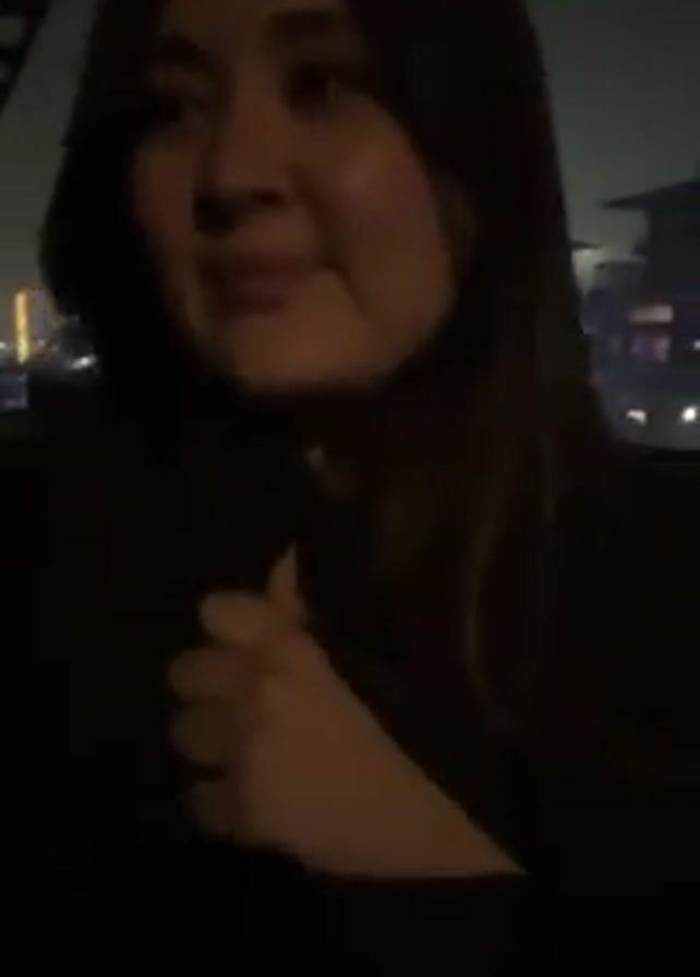 A blurry video shows a woman standing outside at night. She has long dark hair and is wearing a dark jacket or sweater. She is facing the camera, but the video is out of focus, and it is difficult to make out her features. She has her hand up near her chest. In the background, there are some blurry lights and the vague outline of buildings, suggesting she is in an urban environment. The overall lighting is dim.