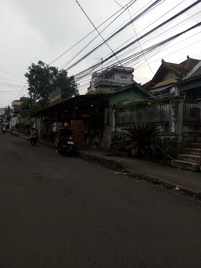 A street view shows a building with a sign, possibly a shop or business, alongside the road. A motorcycle with a rider is near the building, and two children are walking close by. Above, numerous power lines stretch across the sky. A gray sky and an overcast day suggest a muted atmosphere. A building with a distinctive roof is seen in the background, adding depth to the scene.