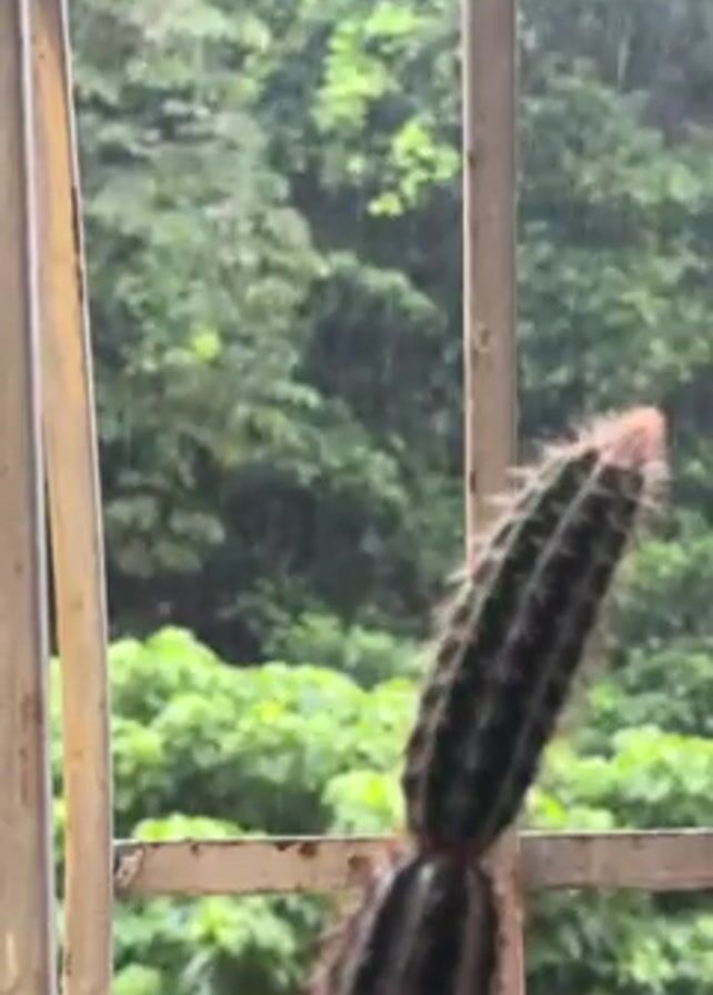 close-up of a cactus in a pot, sitting in front of a metal railing. The background is a blurry view of lush green trees and vegetation. It is raining heavily, with rain streaks visible against the green background. The cactus is green with light-colored spines and a reddish-pink tip. The railing is painted a light color and shows some signs of rust or weathering. The overall scene appears to be outdoors, likely on a balcony or porch.