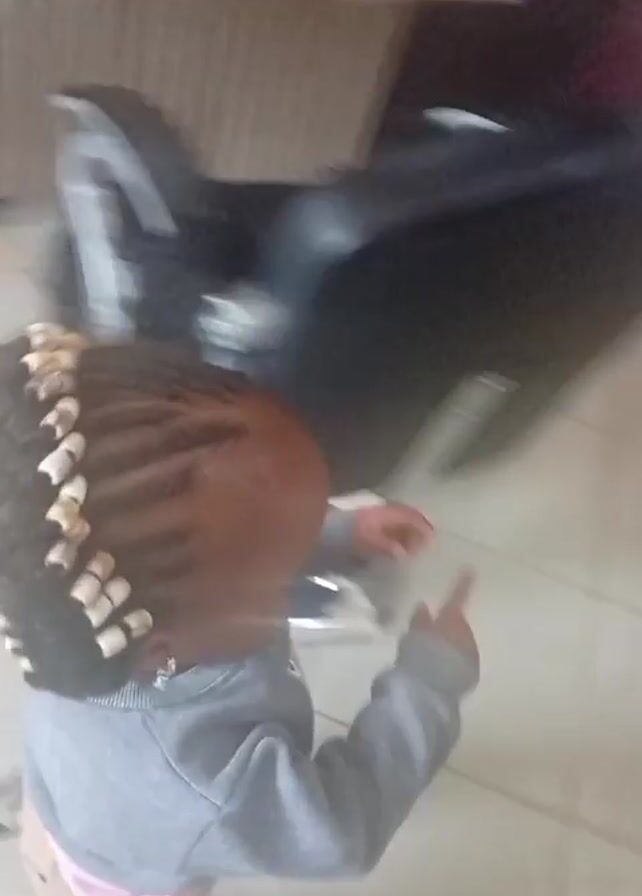 toddler walking away from a motorcycle towards a sofa. The toddler has braids with beads and is wearing a gray long-sleeved shirt, pink undershirt, and khaki pants with dark shoes. They are walking on light beige tile. There is a motorcycle with silver accents and a black sofa in the background. The video is slightly blurry.