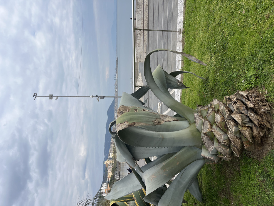 The image depicts a coastal promenade scene in Salerno, Italy, under an overcast sky. In the foreground, a large agave plant with numerous grey-green leaves, some exhibiting brown desiccation and curled tips, is rooted in a patch of green grass. Its thick, segmented stem base is visible. Behind the grass and agave, a grey paved promenade runs horizontally, bordered by a low concrete wall and a metal railing composed of four horizontal bars. A tall, slender grey metallic pole stands centrally in the mid-ground, equipped with multiple surveillance cameras at various heights and a weather vane-like sensor at its peak. A thin dark line, possibly a utility cable, traverses the sky horizontally in the mid-distance. On the promenade near the water's edge, two indistinct human figures are observed; one appears to be walking on the far right, and another is partially obscured further left. Several seagulls are visible on the railing or at the water's edge. The background shows the calm, grey expanse of the Gulf of Salerno. The distant left coastline features a cluster of multi-story buildings, including a prominent white structure, situated against rolling green hills. To the far right, a more urbanized skyline with taller buildings is visible on the distant shore. The sky is uniformly covered by dense grey clouds.