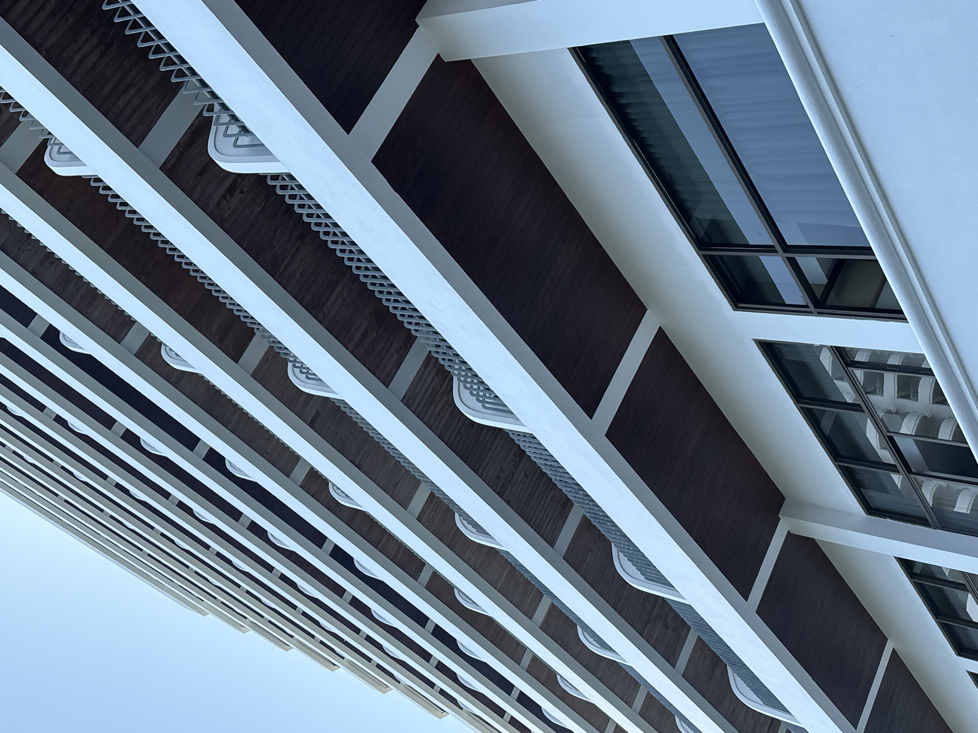 An eye-level, oblique-angle shot reveals the exterior of a building. The architecture includes white structural elements, dark wood-toned inlays, and numerous windows that reflect the sky and surrounding buildings. There are long, horizontal lines formed by the architectural design, as well as a pattern of repeating semi-circular details, The sky is visible in the lower-left corner. The building is in Pattaya City, Thailand.