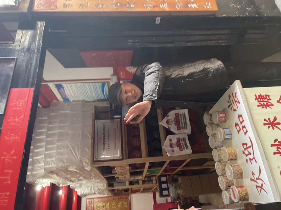 An elderly man wearing a black jacket and cap stands in front of a shop. Shelves behind him display bags and containers of goods. Signs with Chinese characters are visible. One sign reads "Ming Mountain Water Chongqing City". A certificate from the Jiangjin District Department of Culture is displayed. Another sign advertises "Changhua Fried Rice Candy" and "Welcome to taste". The shop appears to specialize in rice-based snacks and sweets.