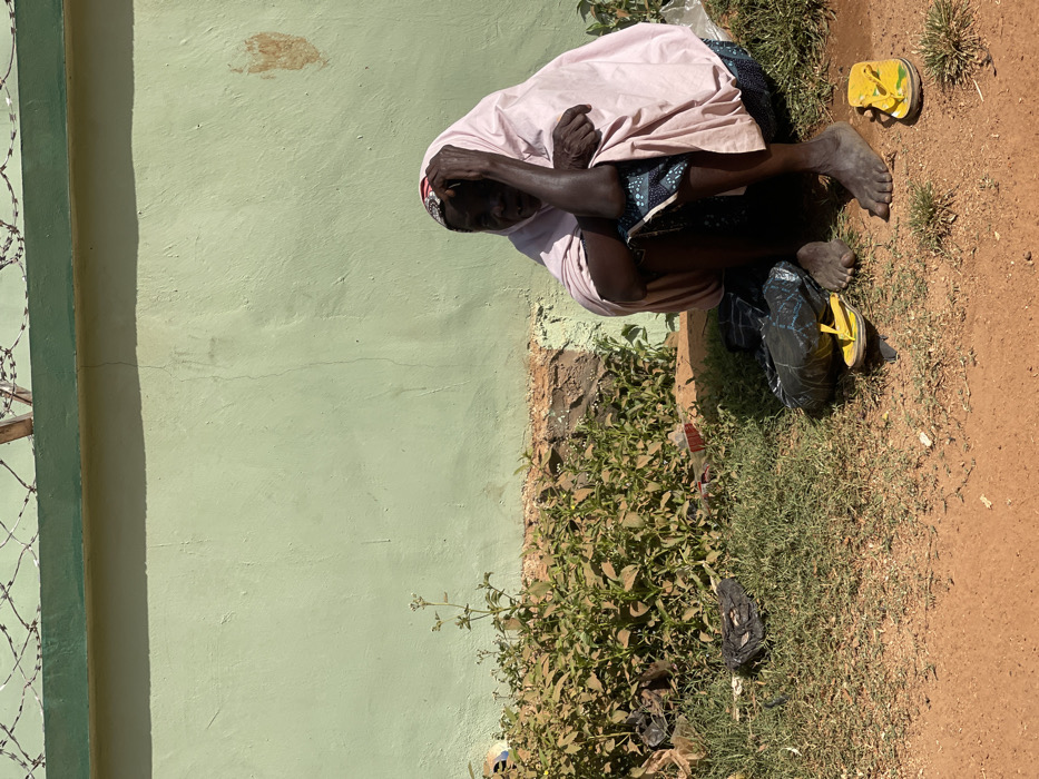 In Unguwar Gabas, Nigeria, an outdoor scene depicts an individual seated on the ground against a light green wall under strong daylight