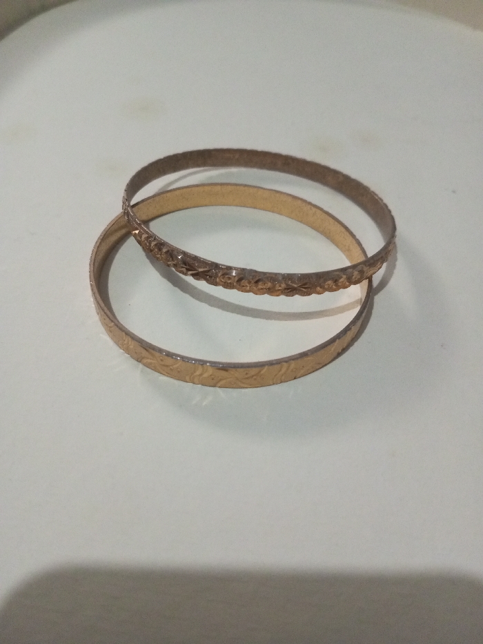 Two gold-colored bangles rest on a flat, light-colored surface. One bangle is textured with a repeating pattern of flowers or stars around its circumference. The other bangle has a similar, yet distinct, textured pattern with tiny leaf-like shapes. They appear slightly worn. The bangles are stacked, one on top of the other.