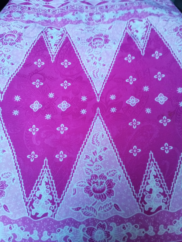 vibrant fuchsia and white textile with a batik-style pattern. The central design features two large, diamond-shaped motifs with intricate floral details within. Scattered throughout the fuchsia background are small, stylized floral and star-like shapes. A decorative border runs along the top and bottom edges, showcasing floral and geometric elements in white against a slightly lighter purple backdrop. The overall effect is a striking and ornate design.