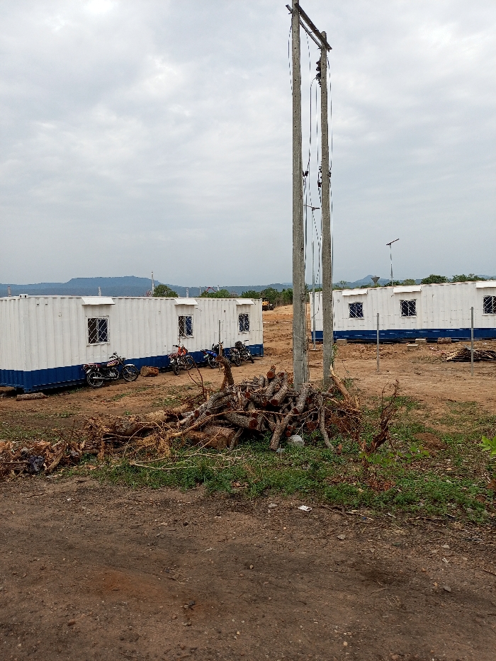 dirt road in front of two white shipping containers with blue trim. There are several motorcycles parked in front of the container on the left. There is a large pile of wooden branches in the foreground, behind the container on the left. The container on the right is slightly further back in the distance. There is an electrical pole in the foreground. The sky is partly cloudy. This is a scene in Ohunene, Nigeria at latitude: 7.497 and longitude: 6.671.