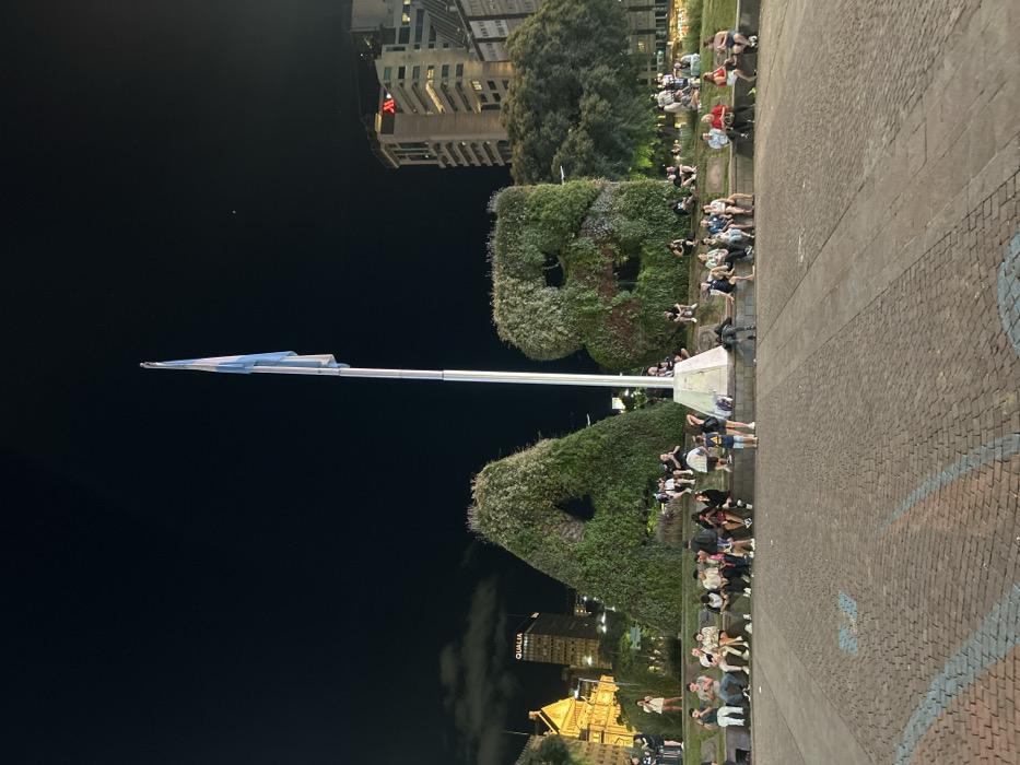 - "A nighttime view of a public square featuring two large green sculptures, shaped like letters or symbols, lined with people sitting and relaxing" by FM-9RuKG2, licensed under CC BY 4.0