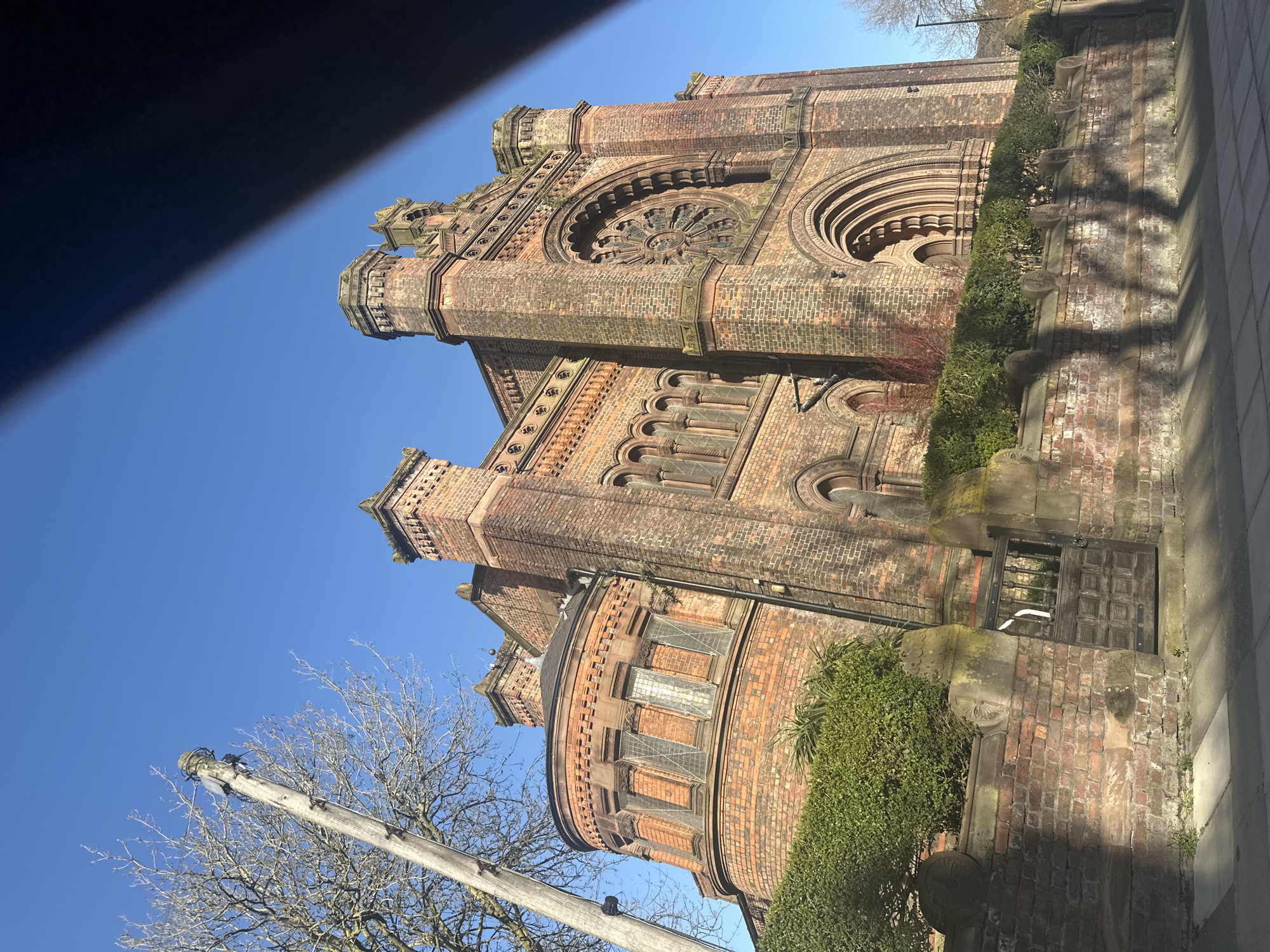 The image depicts a side view of the Ullet Road Unitarian Church located in Liverpool, United Kingdom