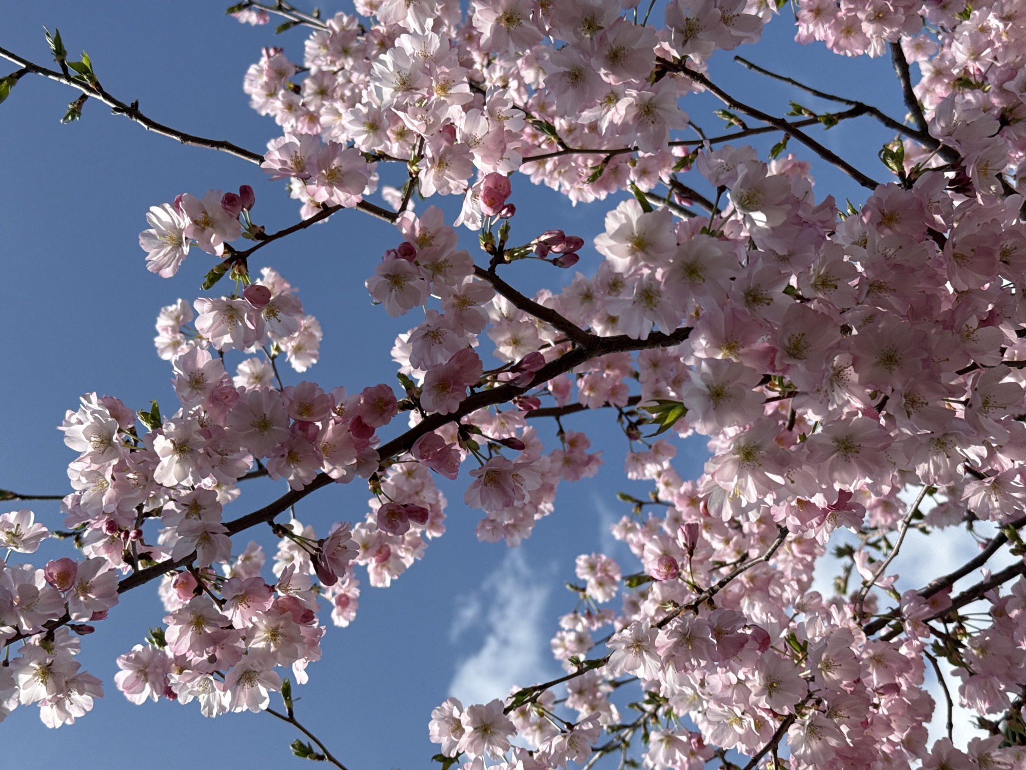 - "A low-angle shot shows branches of a cherry blossom tree laden with pink and white flowers against a bright blue sky with some white clouds" by FM-GCb712, licensed under CC BY 4.0