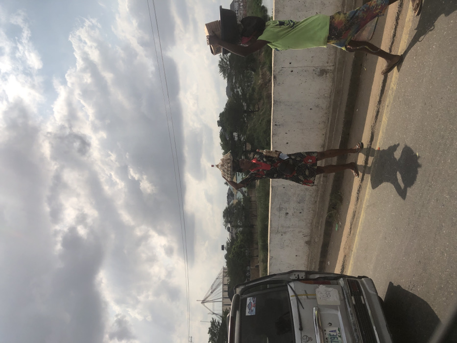 The image displays an outdoor scene on a bridge in Owerri, Nigeria, with the Imo State Government House Chapel visible in the distant background