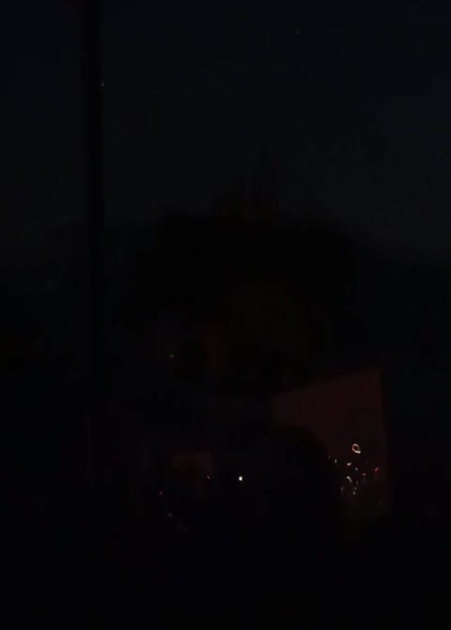At night, a medieval-style stone building sits on a hill. The building is illuminated with white and orange lights, and the surrounding vegetation is illuminated with green lights. A flagpole is visible on the left side of the frame.