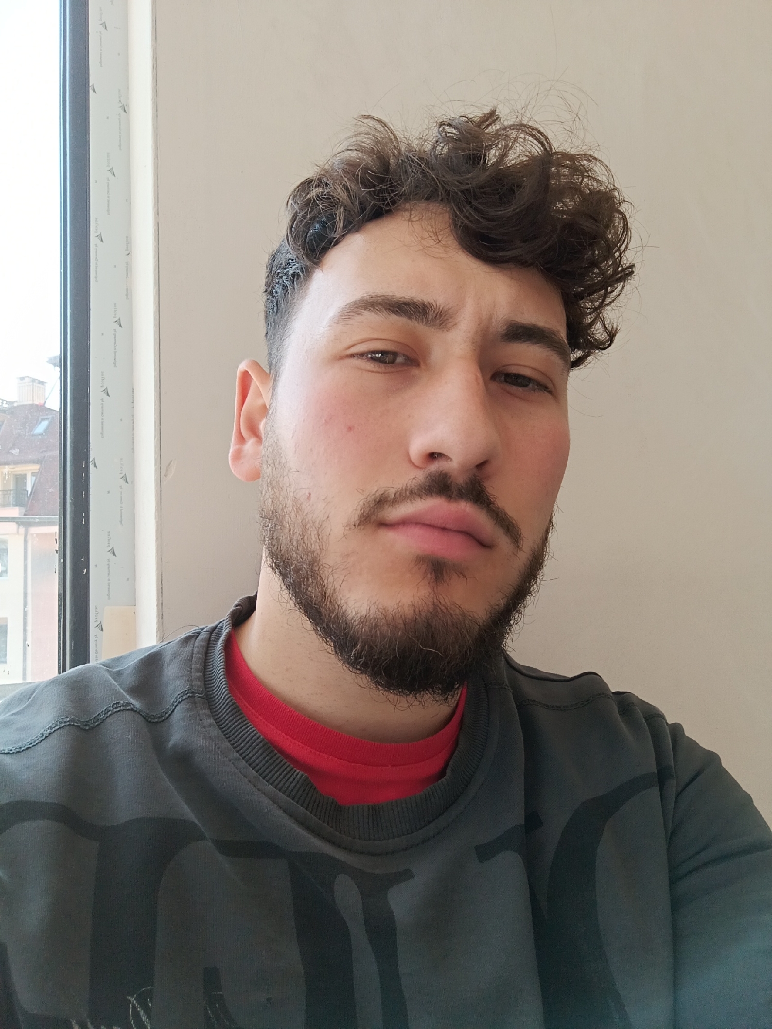 A close-up frontal portrait depicts an adult male with brown, curly hair and a dark beard, looking directly at the camera with a neutral expression. He is dressed in a dark grey crew-neck sweatshirt with a darker grey pattern, layered over a visible red collar. To the subject's left, a white PVC window frame is visible, offering a view of an urban environment. Exterior buildings feature pitched reddish-brown tiled roofs and facades in shades of pink, brown, and grey; a dormer window is present on one visible roof. The window frame itself displays repeating Cyrillic text, partially legible as 'РЕГУЛА'. This indoor scene is situated in Sofia, Bulgaria, overlooking an urban residential or commercial district.