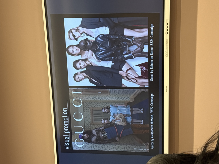 A digital presentation screen displays two distinct Gucci visual promotion campaigns