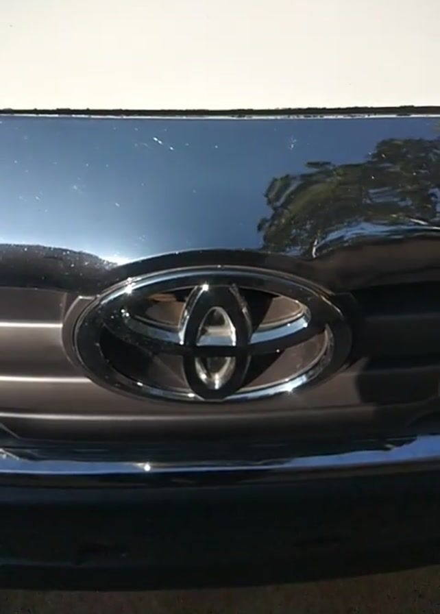 close-up of a white Toyota vehicle. The camera first focuses on the front grill with the Toyota emblem in chrome. It then pans to the left, showing a portion of the windshield with a small decorative object affixed to the inside of the glass and a windshield wiper. The background appears to be an outdoor setting with trees or buildings reflected in the vehicle's shiny surfaces. The lighting is bright, suggesting daytime.