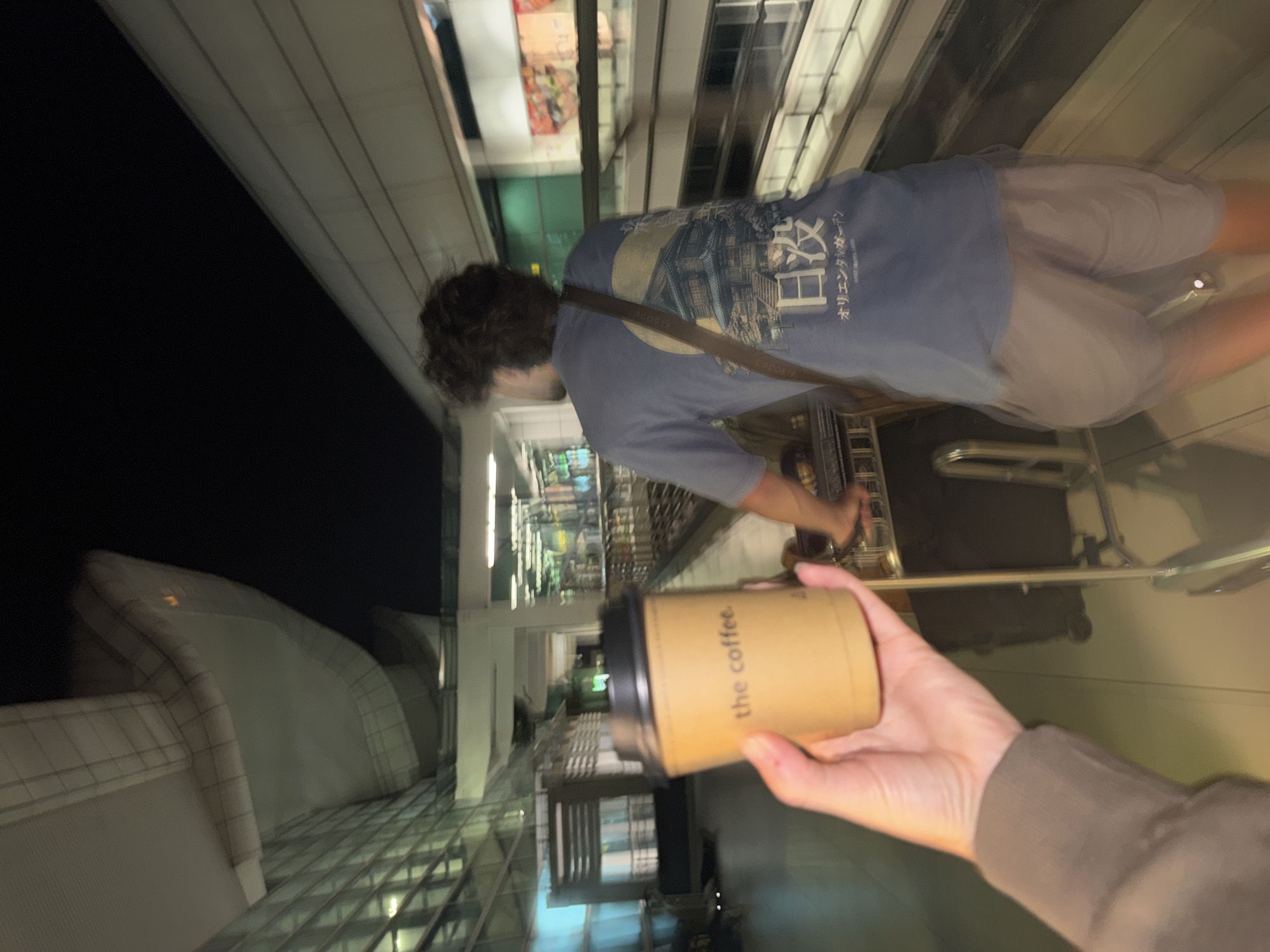 The image captures an indoor scene within a modern airport terminal, specifically identified as Kuala Lumpur International Airport (KLIA) in Sepang, Malaysia. The setting appears to be during evening or nighttime hours, indicated by the dark background beyond the glass walls and the reliance on artificial interior lighting. In the foreground, a left hand, displaying light skin and a short fingernail, firmly holds a light brown paper coffee cup with a black lid. The cup is marked with the black text "the coffee.". The arm visible in the foreground is covered by a brown long-sleeved garment. Slightly ahead and to the right, a male individual is seen from behind, actively walking forward. He possesses dark, curly hair and wears a light blue t-shirt adorned with a graphic print on the back depicting a Japanese-style building and Japanese text, including "日没" (sunset) and "オリエンタルガーデン" (Oriental Garden). A brown strap, indicative of a shoulder bag, is visible diagonally across his back. He is dressed in light-colored shorts, and his lower legs appear blurred due to motion. This individual is pushing a standard metal airport baggage cart, partially visible beneath him. The environment showcases the airport's modern architecture, featuring expansive glass walls on the left that reflect interior lighting, and a complex ceiling structure with angular, light-colored panels. Various ambient light sources illuminate the terminal. Blurred structures and railings are visible in the background, suggesting multiple levels and concourse areas.