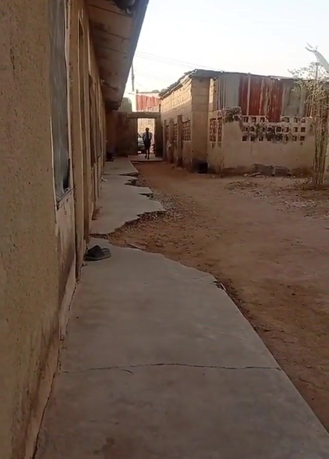 narrow, dusty alleyway between two buildings. The buildings are made of concrete and have a weathered appearance. A concrete walkway runs along one side of the alleyway, with visible cracks and damage. A pair of black sandals is visible on the walkway. A person, likely a woman, is seen walking through a doorway at the end of the alley. She is wearing a light-colored top, a dark skirt, and has dark hair. A car is partially visible behind her in what appears to be a yard. The sky is visible at the top of the frame.