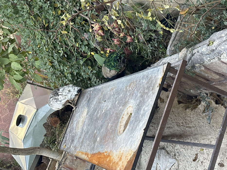 The image depicts an outdoor scene in the city of Unknown, Unknown, featuring two peacocks amidst an overgrown, semi-industrial environment. A large, rectangular, heavily rusted metal panel with two prominent circular depressions occupies the foreground, supported by a basic metal frame. A white and black patterned peacock stands on this panel, oriented with its back mostly towards the viewer, appearing to observe the surface or ground directly in front of it. Below and to the right of the panel, partially obscured by dense green foliage and vines, is a second peacock with vibrant green and brown plumage. In the background, behind the standing peacock, a dislodged, multi-faceted metallic structure resembling a large vent or chimney cap, with a circular opening at its apex, rests on a pile of logs. The surrounding environment consists of abundant green and some yellowish-red leafy vegetation, bare tree branches, a tree trunk, a reddish-brown wall or structure in the upper background, and lighter-colored, possibly sandy or gravelly ground beneath the metal panel and adjacent to some rough stone-like structures in the lower right.