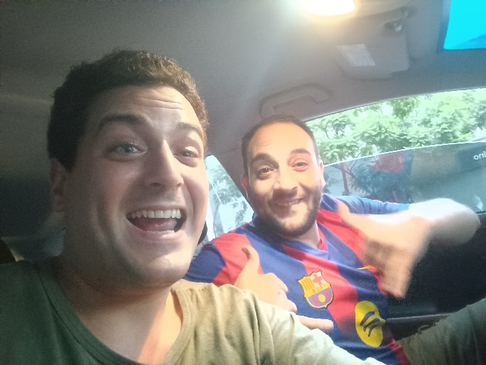 Two males are present inside a vehicle. The individual in the foreground, left of center, has light skin, dark hair, and blue eyes, wearing a green t-shirt. His mouth is open, revealing teeth, and he is looking directly at the camera. The second individual, positioned behind and to the right, has light skin, dark hair, and a beard, wearing a red and blue striped FC Barcelona jersey. Both individuals are smiling, with the background individual displaying two thumbs-up gestures. The vehicle interior shows a light-colored headliner, an overhead light fixture, and a sun visor. Through the vehicle's windows, a green outdoor environment with foliage is visible. A white sign with the letters "oni" is partially discernible through the rear passenger window. The scene is located in the city of Buenos Aires, Argentina.