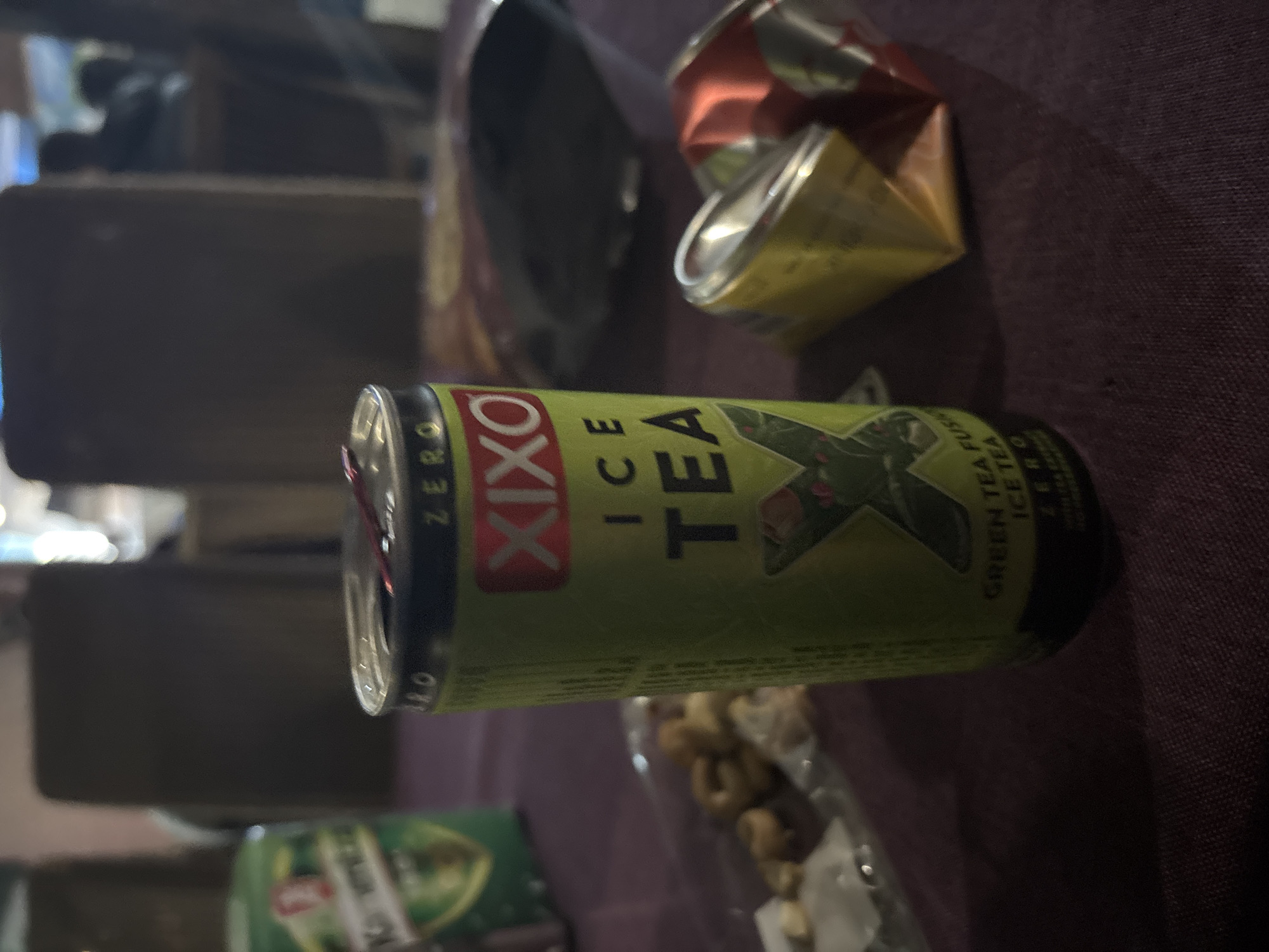 can of Xixo Ice Tea, Green Tea flavor, lying on its side on a dark purple surface