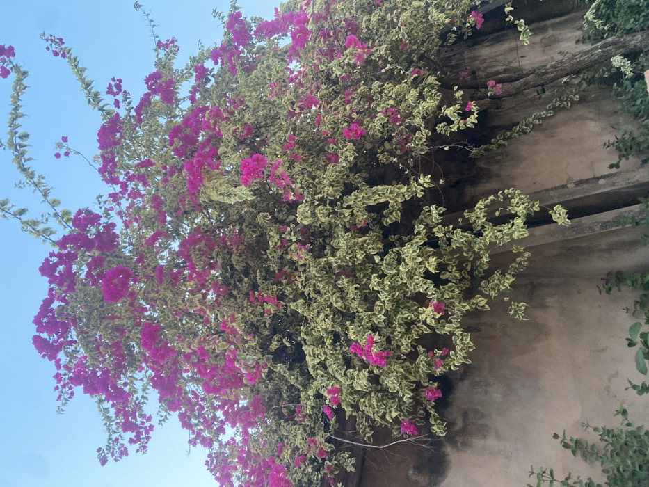 - "The image displays a large bougainvillea plant with vibrant magenta flowers and variegated light green and cream-colored foliage, growing extensively over a weathered, textured, light brown-grey wall in Alor, Nigeria" by FM-Ryd1w1, licensed under CC BY 4.0