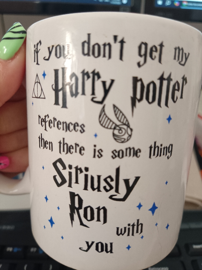 - "A white ceramic mug, bearing the inscription "if you don't get my Harry Potter references then there is some thing Siriusly Ron with you" in black stylized fonts, is depicted in a close-up, slightly angled view" by FM-BdCXB3, licensed under CC BY 4.0