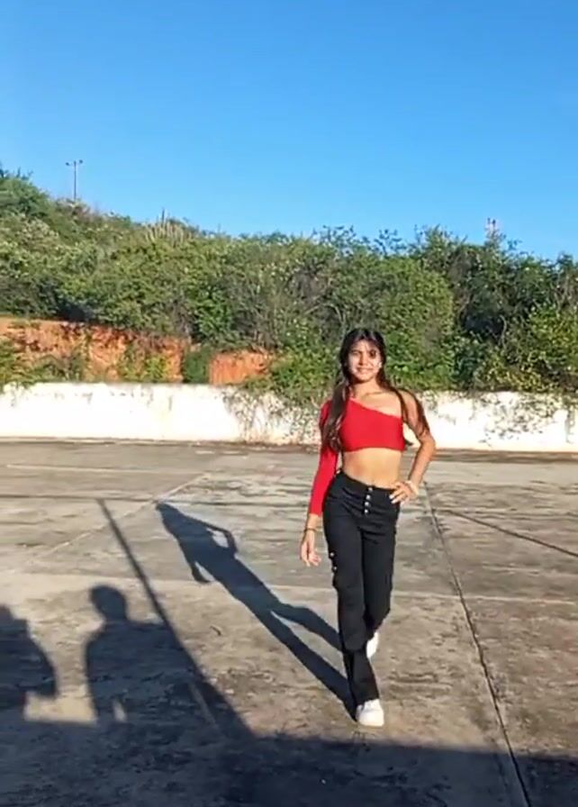A young woman is walking towards the camera in an outdoor setting under a bright blue sky. She is wearing a red one-shoulder top, black pants, and white shoes. The surface she is walking on appears to be concrete, showing visible cracks and patterns. In the background is a low retaining wall, behind which there is greenery. The shadow of a person or object is visible on the left side of the frame, suggesting the presence of someone or something outside of the shot.
