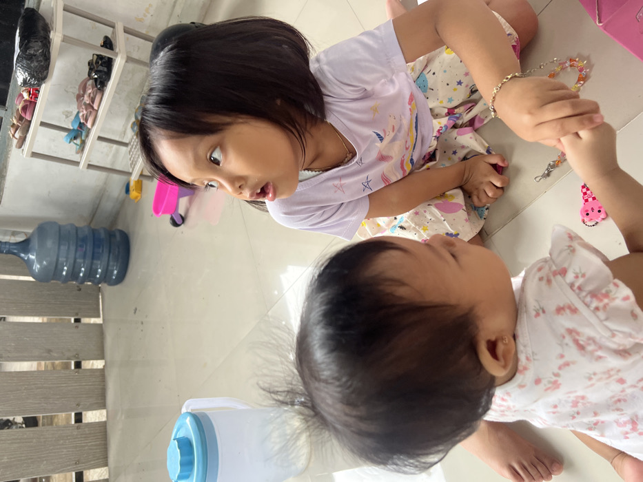 Two young girls are sitting on a tiled floor. One girl, older with short black hair, wears a light purple shirt and patterned skirt. She looks down, holding the hand of a baby wearing a white floral top. Nearby are toys, including a colorful bracelet. A water dispenser, a water cooler, and a shoe rack are visible in the background. The scene appears to capture a candid moment of sibling interaction.