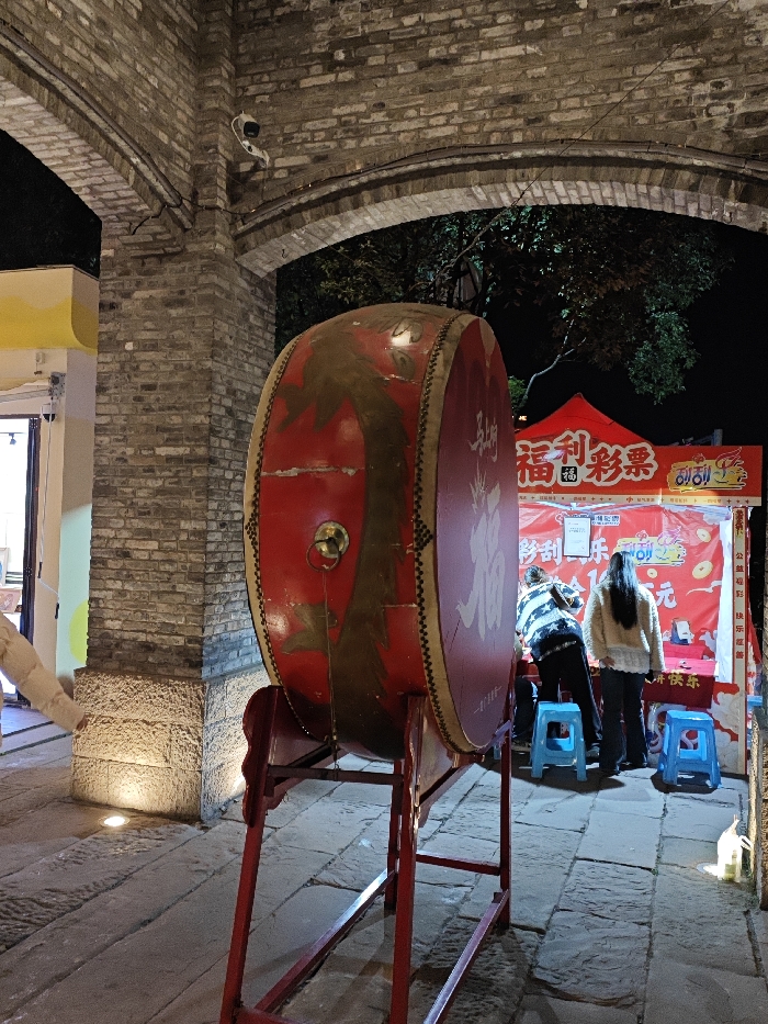 This nighttime image depicts an outdoor scene in Nan'an District, China, characterized by traditional brick archways and stone paving. In the immediate foreground, positioned centrally, is a large, vertically oriented red traditional Chinese drum on a red stand. The drum is adorned with faded gold or brown patterns and Chinese characters, notably "福" (fú, meaning fortune/blessing). A brass ring handle is attached to its side. To the right of the drum, a red canvas stall is set up, illuminated by internal lights. A prominent white banner on the stall displays the Chinese characters "福利彩票" (Welfare Lottery). Two individuals are present at the stall, viewed from behind; one wears a striped garment, and the other a light-colored, possibly textured, jacket. They are interacting with the stall's contents or a vendor. Two bright blue plastic stools are placed in front of the stall. Overhead, multiple brick archways form part of a structure, with visible wiring and a white security camera mounted on a central brick pillar. Dark foliage from trees is visible through the arches and behind the stall. The ground is paved with irregularly shaped stone slabs, partially illuminated by recessed ground lights near the base of a brick column on the left. A small portion of a bright yellow awning is visible on the far left.