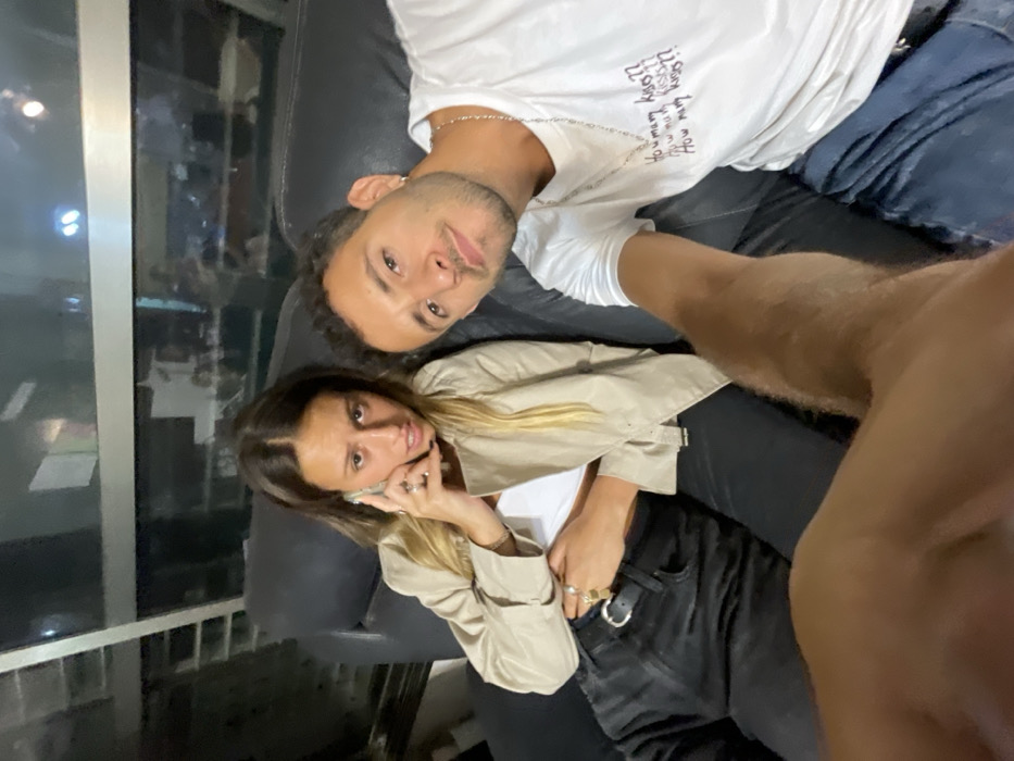A selfie-style image depicts two individuals, one female and one male, seated closely on a dark-colored sofa within an interior space during nighttime