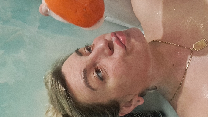 The image presents a close-up, portrait-oriented view of an adult female engaged in personal hygiene within a bathroom setting. The subject has blonde hair, fair skin, and her light brown eyes are directed upward and slightly to her right. Her lips are pursed in a 'kissing' gesture, with white foam present on her lower lip. Her skin on the visible portions of her face, neck, and upper chest appears wet, with small droplets evident. A small silver stud earring is visible in her left earlobe. She wears a gold-colored chain necklace with a rectangular, arched-top pendant resting on her sternum. An orange-colored sponge, covered in white foam, is positioned in the upper right quadrant of the frame, held near her face by an unseen hand. A dark, vertically striped object, possibly a product container, is partially visible in the lower left corner behind her shoulder. The background consists of a light blue-green wall or tiled surface featuring a subtle, mottled pattern. The scene is located within an unspecified indoor facility in the city of Меткомелино, Russia.