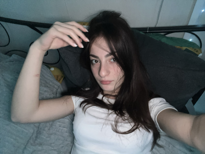 A young woman lies on a bed covered with a gray quilt. She wears a white T-shirt and has dark hair, partially tied up. Her right arm is extended toward the camera. Behind her are dark gray pillows and a black metal bed frame. The overall lighting is soft and dim.