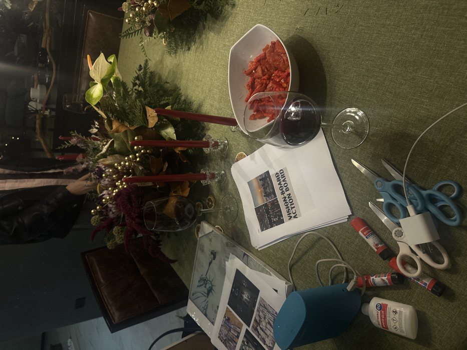 A table with a green tablecloth is arranged with a floral centerpiece, red candles, and two wine glasses, one with red wine. A bowl of red snacks, possibly spicy, sits next to a stack of papers labeled "Vision Board Action Board." Craft supplies, including scissors, glue sticks, and a bottle of glue, are scattered around the papers. A partially visible picture board and a blue Google Home device complete the scene.